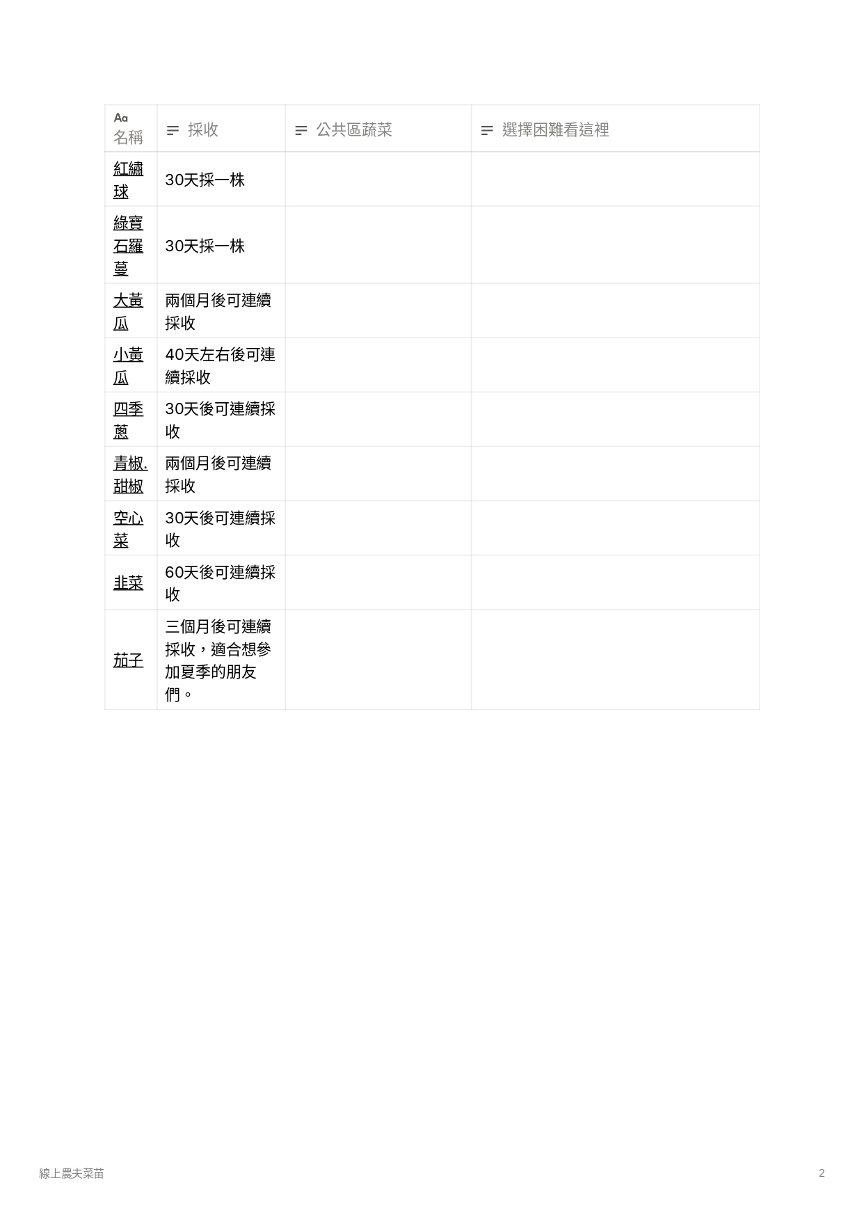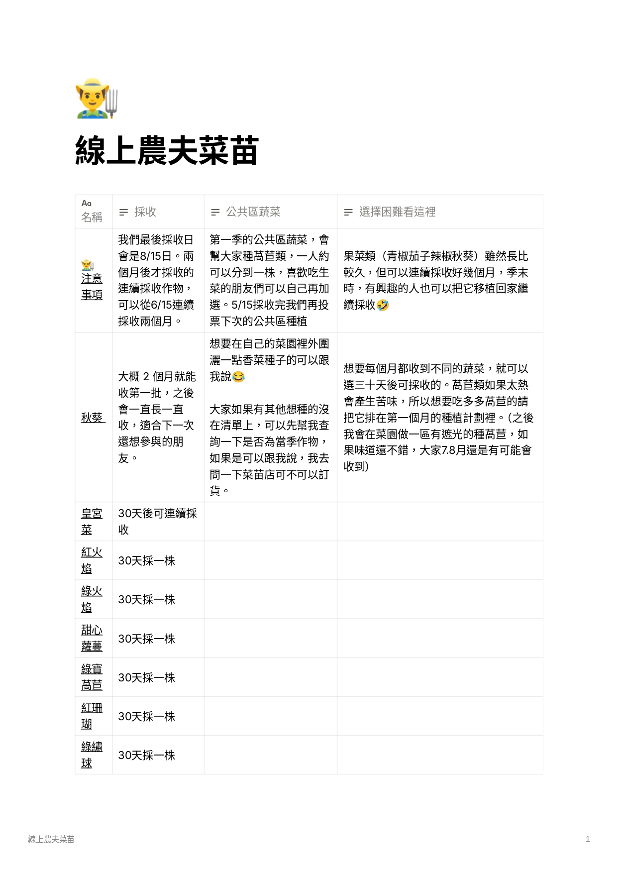 請大家將自己想要種的菜以及以下問題,利用下面的留言區留言給我(內容都會是隱藏的)
